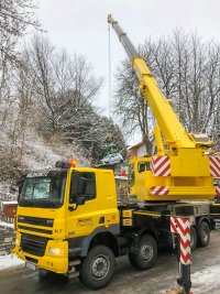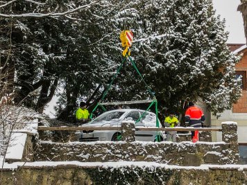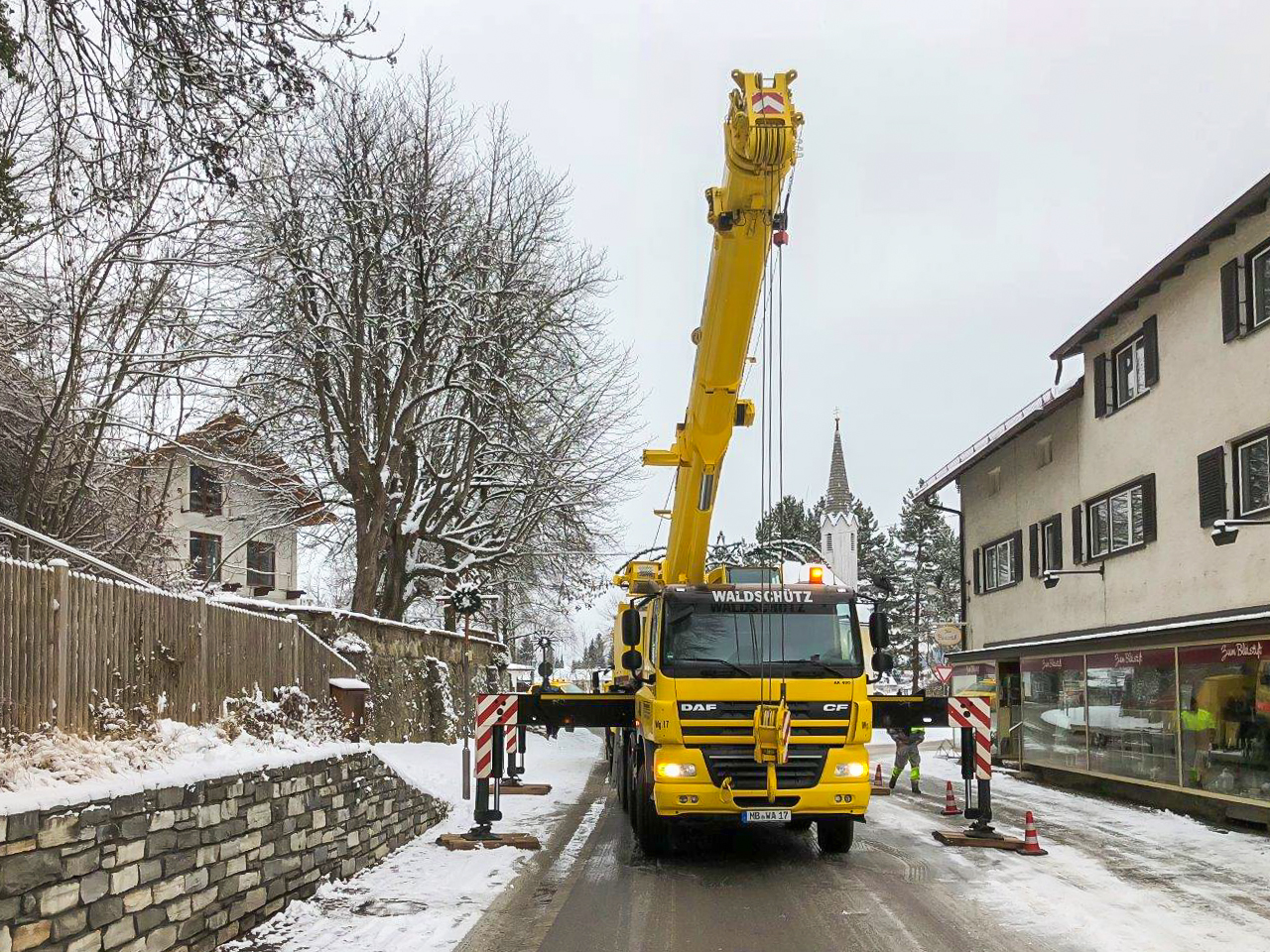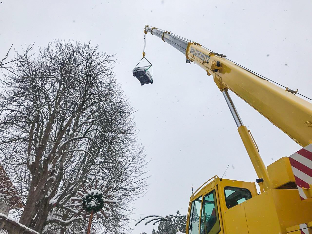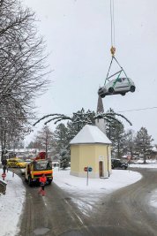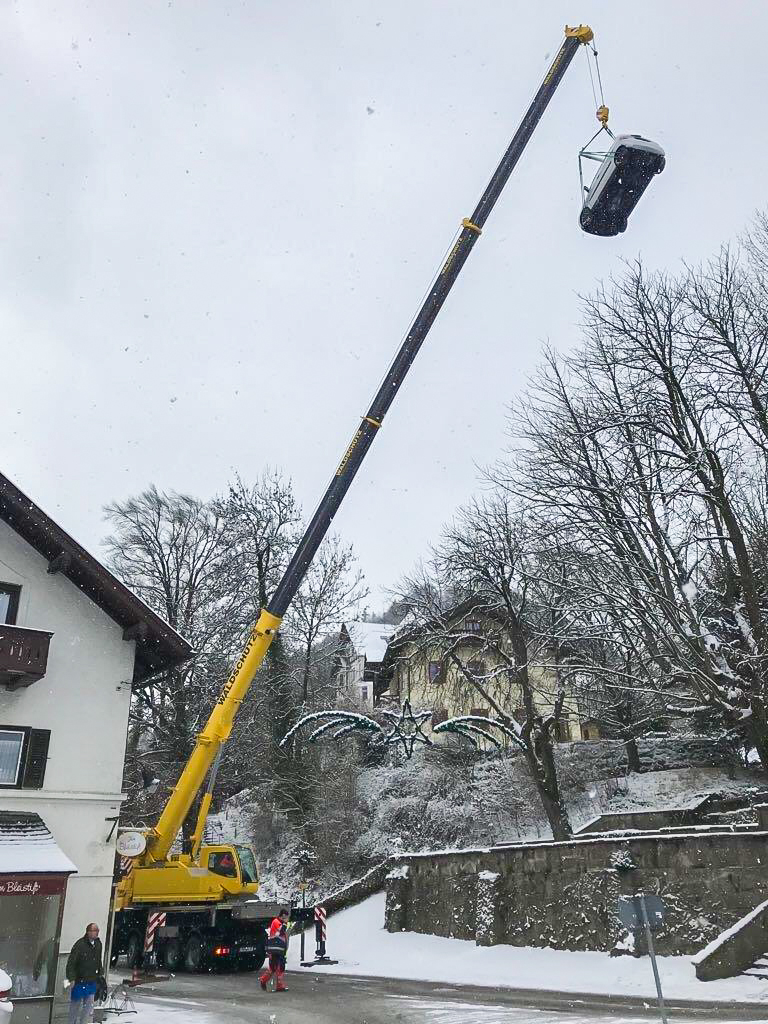 Da eine Bergung von der steilen Straße aus nicht möglich war, wurde der PKW mit einem Mobilkran und einer Bergetraverse über die hohen Kastanienbäume des Biergartens geborgen und herausgehoben.