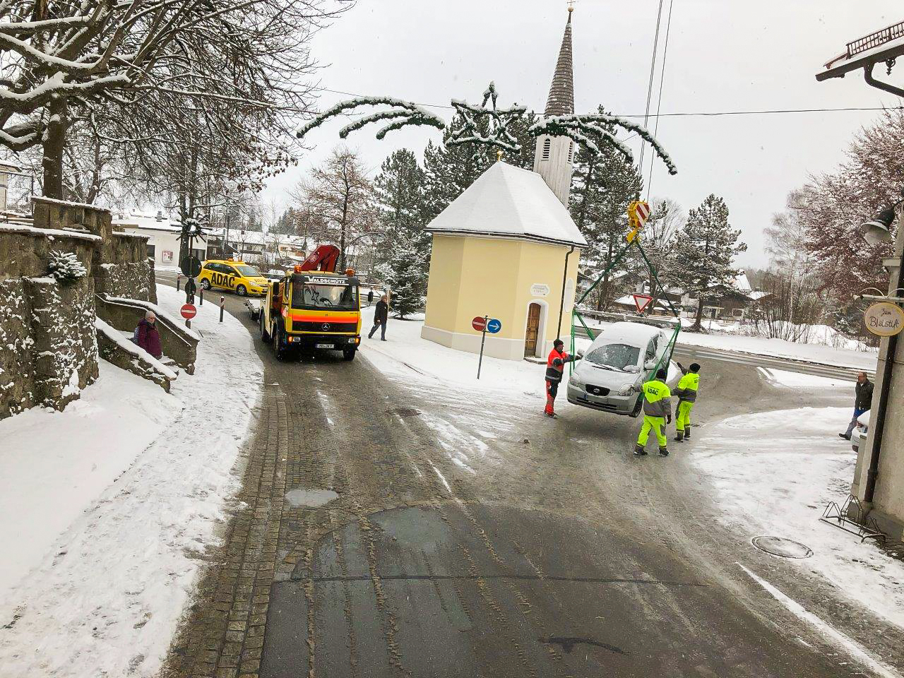 Kurz vor Weihnachten war ein PKW auf einer schneeglatten Straße rückwärts auf die Terrasse eines Biergartens gerutscht.