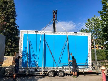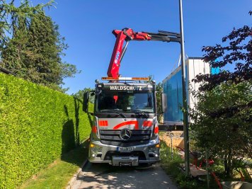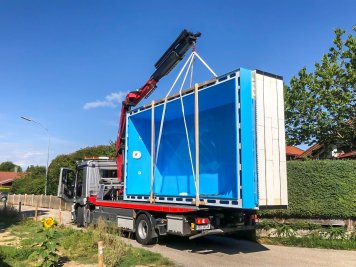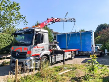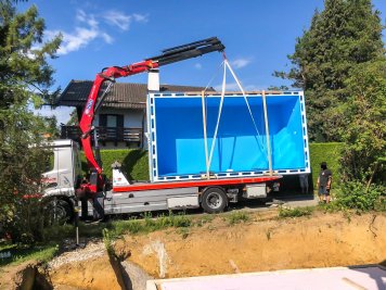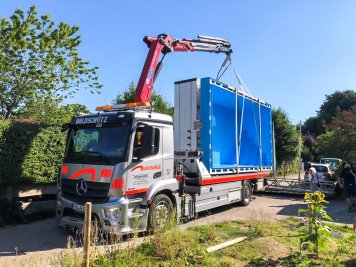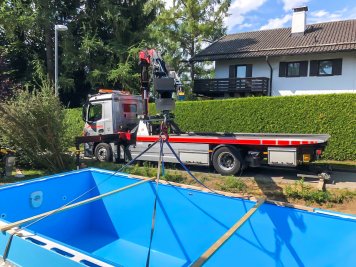 Doch manchmal war der Platz in der Siedlung beengt und wir konnten dann nur mit unserem Ladekran des LFBK den Pool vom Anhänger übernehmen und punktgenau einheben.