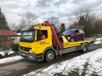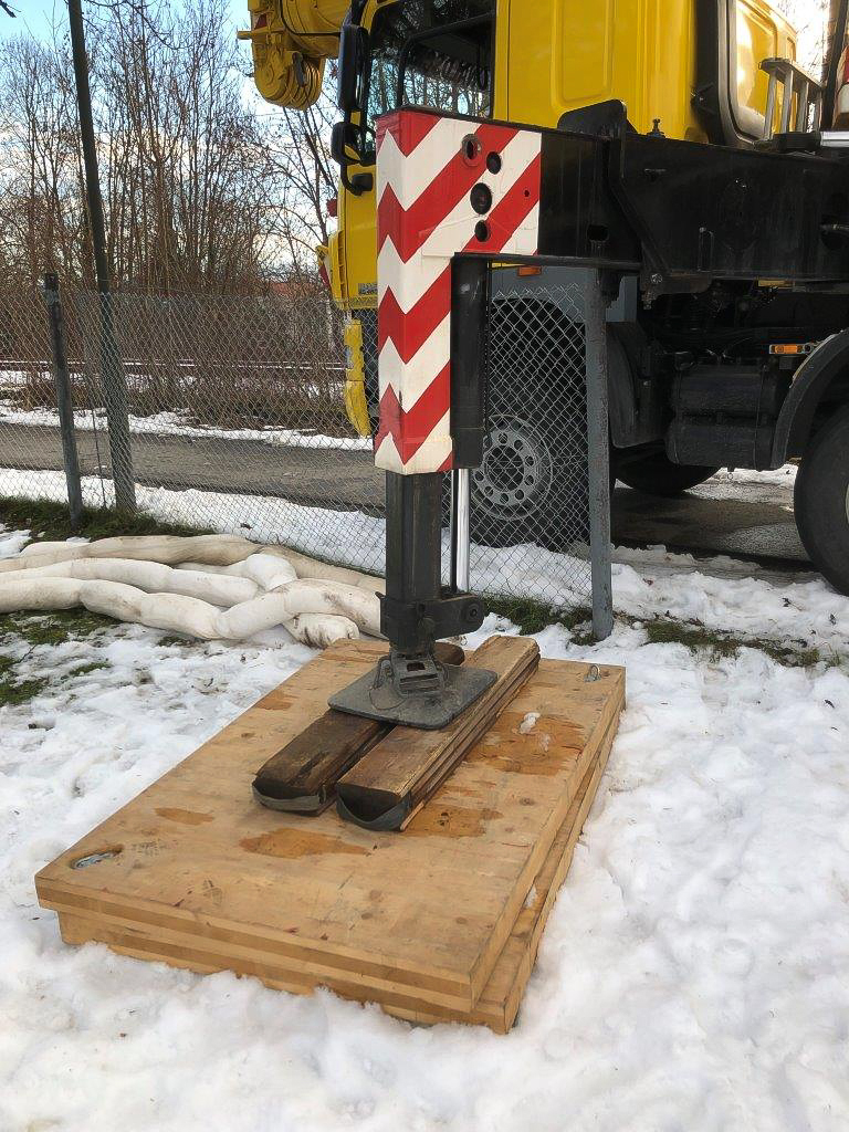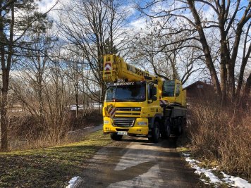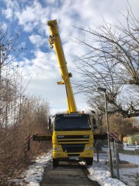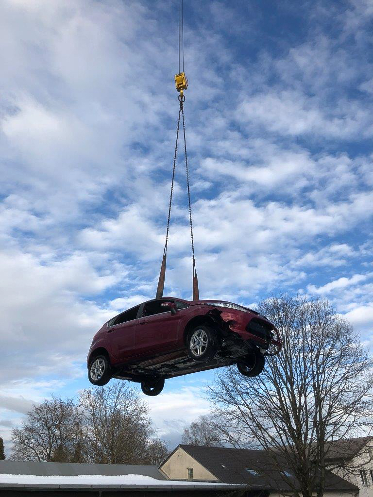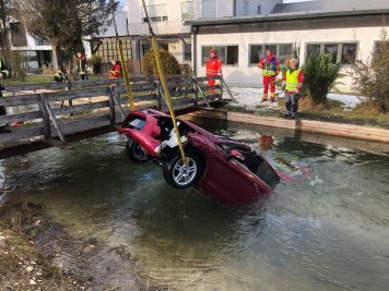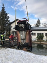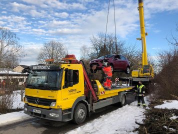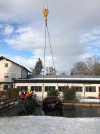 Da die Unfallstelle nur über einen schmalen Radweg zu erreichen war, fuhren wir mit unserem 40 t Autokran zur Unfallstelle. Vor Ort wurde das Fahrzeug dann von Tauchern der Wasserwacht mit Gurten am Kran angehängt und der PKW bei einer Ausladung von 27 m geborgen, verladen und anschließend abtransportiert.